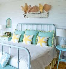 Nautical red is predominant in this bedroom designed by Brian Patrick Flynn. The mirrored furniture and curvy bedding pattern are a subtle nod to coastal style. Guest bedrooms should be relaxing and inviting, so decorating with coastal accents will make guests feel welcome. Designer Gina Fitzsimmons surrounded the room with a soft blue color palette and completed the look with starfish furnishings.