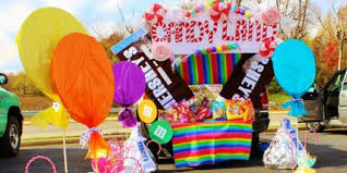 Angry Birds Trunk Theme ~ An easy and inexpensive way to decorate your trunk if you’re an Angry Bird’s fan. All you need is spray painted boxes and stuffed bird’s.10. 50’s Themed Diner ~ Poodle skirt, vinyl records, bar stools, checker board and neon lights are perfect for a 50’s themed trunk.11. Mary Poppins ~ This Mary Poppins car theme is practically perfect in every way!12. The Black Hat Shoppe Trunk or Treat ~ Decorate your car for trunk or treating with this Black Hat Shoppe witch theme featuring a bakery, awning and menu.13. Mad Science Lab Trunk or Treat ~ Create a spooktacular Mad Science theme using apothecary jars for all things creepy and crawly and don’t forget to add your mad scientist. Treasure Chest Pirate Themed Car ~ Yo ho, a pirate’s life for me! How cool is this treasure chest filled with gold candy?15. Candy Bandit Themed Trunk ~ Use items around the house to decorate your car. You can use lanterns, doormat and pumpkins.16. It’s the Great Pumpkin Trunk, Charlie Brown!