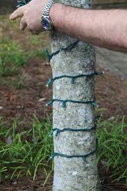 Keep light strings in close proximity to the tree to prevent wind and storm damage. DIY Wrapping Trunks and Branches The following DIY image tutorial used a single 70 count LED light string and wrapped a trunk approximately 4'H and 10" diameter, as well as two branches. A tighter wrap and more branch coverage is recommended.Create a ball of lights to make wrapping easier, connect male plug to power source at base of treeWrap lights up and down the length of main branches Wrapping Lights on Evergreens Evergreens retain most of their leaves during winter and include Spruce, Pine, and Firs, as well as other varieties. Using our Recommended Number of Lights can help in determining how many light strings are needed, as well as which size bulb. Lights should be checked before installation, especially when lighting larger trees that will be almost impossible to fix once all the light strings are on. 3-Way splitters and power taps may be needed to extend outlets up the length of taller trees.
