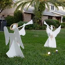 Now for outdoor decorations, I like to use things that you can see both in the day AND at night. For us it’s important to have decorations you can clearly see outside during the day since most of the traffic in front of our home is in the daylight hours. To achieve those day decorations, we like to use DIY plywood Christmas cutouts. These reindeer shown above were made by a friend last year. They were all white with red bows, but this year I spray painted the antlers glittery gold. They are so cute! This year my husband made these two pretty plywood angel cutouts for the other side of our yard. These are painted white with the same glittery gold paint on their halos. Then I added pretty sparkly gold ribbons on their waists. These reindeer are very easy. You can buy the pattern online or download it, cut it out, trace it, and get your jigsaw out. The parent reindeers are about the same size, one with head down, and one with the head up. The angels are a bit more difficult to do, but are well worth the effort.