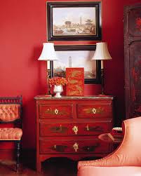 An ornate, vividly colored fabric, such as this Turkey red damask tablecloth, instantly adds warmth and a sense of refinement. A screen painted scarlet showcases the best of functional design, punctuating the room while displaying playing cards and postage stamps. A 1930s Chinese Chippendale-style fish tank showcases a red mini-orchid. Even the covers of the books on the shelves -- a collection of Loeb classic, a series of works in Latin translated into English -- contribute to the color scheme. The Most Vivid Red Room In this formal dining room, a black lacquered Chinese screen, an Indian carved-teakwood table, and a pair of modest beige armchairs counterpoint the red-hued walls, upholstery, and carpet. The fireplace-wall paneling and the curtains are embellished with reddish faux-bois effects: The pine paneling was coated with a deep-red glaze and then grained with a reddish-black paint to mimic a luxurious, dark wood; the curtain fabric was silk-screened. Antique red Turkish Oushak carpets, such as this one, are rare.