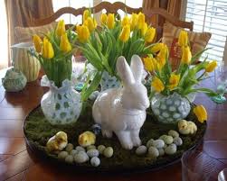 Place the eggs in a carton or individually in eggcups. Get more fun Easter ideas from HGTV Magazine A wisteria-covered lattice in HGTV fan kitgo's backyard creates a romantic setting for her family's Easter brunch. In under an hour, you can turn aluminum foil (yes, aluminum foil), Spanish moss, tree bark and sphagnum moss into a realistic bird's nest you can fill with painted robin's eggs or Easter treats. Blown-out pastel eggs are strung together to create this colorful garland. To make the ultimate centerpiece, group egg vases together in faux nests or an Easter basket. Dye some of the eggs to add more color to the table. Just a few pots filled with blooming plants will add a lot of impact for very little time, money or effort. HGTV fan nyclq keeps the same black painted pots on her porch year-round and switches out their contents to reflect the season. Tall manzanita branches hung with paper butterflies create an architectural centerpiece for this sun-washed spring table setting by thrify diva Kate Riley.
