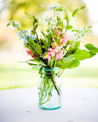 Jars filled with white stock flowers and roses were placed in small groupings down the tables. See Ways to Use Mason Jars in Your Wedding Complementing a rustic barn venue, arrangements of eucalyptus leaves, carnations, lavender, and cotton blooms housed in various glass vessels, while gold painted pomegranates accented these reception tables. See Centerpieces with Fruits and Vegetables Arrangements of dahlias, 'Majolica' roses, scented geranium, gomphrena, snap dragon, and exploding grass dotted the tables at this wedding reception and fit the vibe on Martha's Vineyard. Cream and white dried ammobiums set in Mason jars and tied with twine created a down-home look for an autumn wedding on the West Coast. See More Gorgeous Fall Centerpieces Tall cobalt-blue vases filled with white orchids looked even more striking in this seaside Florida setting. Get Summer Wedding Flower Tips From Pro Florists A variety of wildflowers, each bunched together in individual vases, created a sophisticated and budget-friendly decoration.