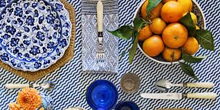 A geometric print tablecloth, blue and white floral napkin patterns paired with Iittala Taika salad plates come together beautifully to create a magical look. Mini terrarium centerpieces add drama and place cards welcome guests instantly. Maranta foliage with curly willow tips and a sunset-orange garden rose are placed in five-inch round vases to create arrangements that take no time to put together. Place evenly along the length of the table and alternate with glass votives to make a dramatic centerpiece. Use silver trays to contain beverage bottles and prevent spills on the tablecloth. Never assume all your guests have the same preference for water so have both still and sparkling on the table. This modern rustic look works just as well for a backyard party as it does for informal indoor meals. Pinecone dinner plates with a handmade burlap runner above a striped tablecloth create a cozy provincial look. Single anemones in clear flute vases and silver serving dishes filled with lemons and limes make appealing, no-fuss centerpieces for year-round entertaining.
