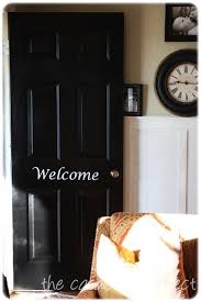 I start with the areas around the panels by using a good angled paint brush: The folks at Purdy sent me a set to use and I was in heaven. I used the 1.5 inch angled brush for the little insets in the door: Purdy brushes are the best – hands down. And I’m not saying that cause I got a set. I love them and use them all the time! The BIN primer is so thin, you don’t have to worry too much about brush strokes: I didn’t take the hardware off to paint the back of the door – I just taped around it and it worked out pretty well. I wish I would have taken if off, but that’s a whole other post. I finished up the door with the primer and let it dry: I use a small roller for the raised panels and the area around them. (Steps 2, 3 and 4 on the pic above.) I started the same process again with my black paint. I use Black Suede from Behr for all of my black paint projects and LOVE it: My friend Kate has mentioned to use Floetrol to cut down on brush strokes: