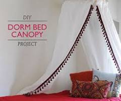 You can hang the sheets down so they hide whatever you store under there, or you can stick a bean bag chair under there to relax in. I would strongly advise against that makeshift hammock though. 7. Glittery mason jars could not be easier to make, and they’ll make really pretty containers for whatever you want. Using them as a vase for fake flowers make a perfect decoration. 8. Making your own headboard is way easier than you would think. This one can be super temporary because it’s not attached to anything. Trust me, this will make your tiny little bed look SO much nicer. 9. Make polka-dot ping-pong ball lights. How pretty are these?! 10. If you’re allowed to hang stuff on your ceiling or walls, make this canopy. It will give you some much-needed privacy. 11. Make a picture garland instead of a collage so that your pics stand out from everyone else’s. 12. Bean bag chairs can easily look tacky and silly. Make yours more mature and pretty by DIYing it up.
