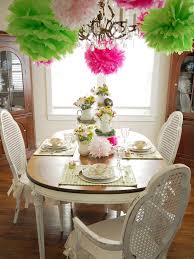 Adorn the ceiling and chandelier with easy-to-create decorations like these colorful tissue pom-poms. Resembling giant, floating flowers, they add a big boost of color and whimsy to the room. Want to make your own? Instructions for creating tissue pom-poms are below. Arrange inexpensive grocery store flowers, such as mums, daisies, alstromeria or carnations, in simple, tightly clustered bouquets placed in small ironstone pitchers. Stack arrangements on glass cake pedestals of various heights for added impact. Instead of basic white linens, opt for color and a touch of pattern, like these lime green and white houndstooth placemats. The upbeat pattern and color keep the traditional china from looking too formal and fussy. Fill miniature baskets with Spanish moss and speckled candy eggs as a sweet treat for guests. Finish each basket with a small tag cut from iridescent scrapbook paper. Label each tag with a guest's name, then attach with twine or ribbon. Place one at each place setting so the favors can also function as place markers.