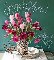 Flower Arrangements in Eggshells More than 20 arrangements to dress your table for Easter, Passover, Mother's Day, or any other joyous spring occasion.Hollowed-out eggshells make naturally beautiful vases for tiny flower arrangements. A watering can holding cut spring blossoms will continue to nurture flowers long after the bouquet is gone. Adorn your spring party table with a mother hen centerpiece filled with pretty hyacinths. Garden Flowers in a Glass Compote Brilliant violet Muscari latifolium and tight blooms of Ranunculus get a boost in a lush, dense display. The flowers look equally fetching in a smaller-scale display. Exuberant crepe-paper daffodils and tulips are a breeze to make -- and you don't have to worry about the arrangement wilting. Tulips and Daffodils in a Nest This nest cradles an exuberant mix of blooms from spring-flowering bulbs -- the botanical counterpart to newly hatched birds. Tulips and Muscari in China Bowl Let your china inspire you.