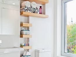 Wooden floating shelves with a molding detail tie into the cabinetry and provide stylish display and storage surfaces. Use low floating shelves to display candles and towels next to your bathtub. These elements can help create a spa-like retreat within your bathroom. A contemporary tile pattern is accented nicely with simple wooden floating shelves next to the vanity. Keep the shelves relatively neat by displaying only a few accessories. This will add warmth and interest without overpowering the strong background. Design by Vanessa DeLeon Simple built-in bookshelves are given some flair with floating shelves that rise up along the wall. The crisp, white shelves pop against a dark, neutral wall color. By adding vertical shelves between windows you can create a fresh and open storage unit in any room. The floating shelves can provide the same amount of storage as a case good without the use of a bulky cabinet or bookshelf. Dress Up Your Design Photo By: the 10 cent designer